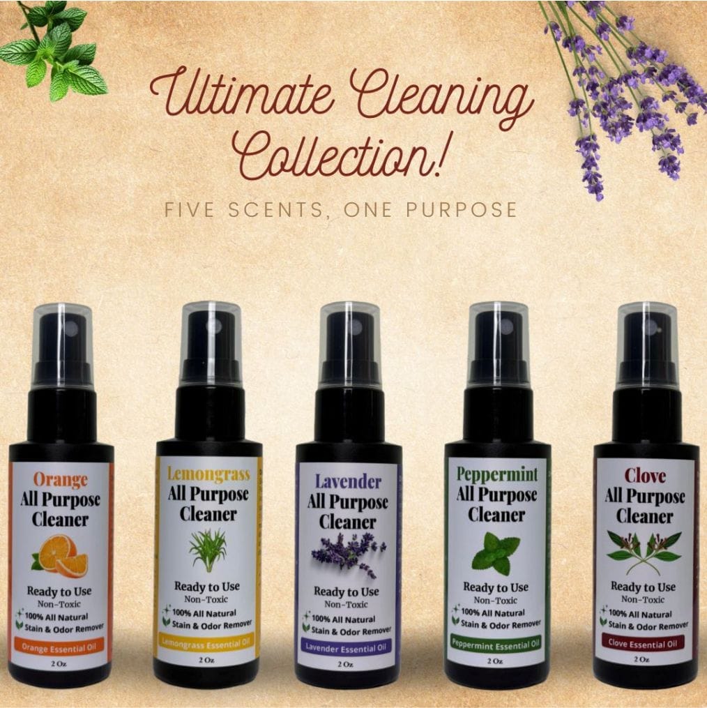 All Purpose Cleaners Variety Pack – Discover your favorite way to clean naturally. This bundle includes five refreshing scents—Clove, Lavender, Lemongrass, Orange, and Peppermint—all crafted with food-safe GRAS list ingredients for a healthier home. Tough on grime yet free from harsh chemicals, toxins, and synthetic fragrances, each cleaner brings powerful results with the uplifting benefits of natural essential oils.