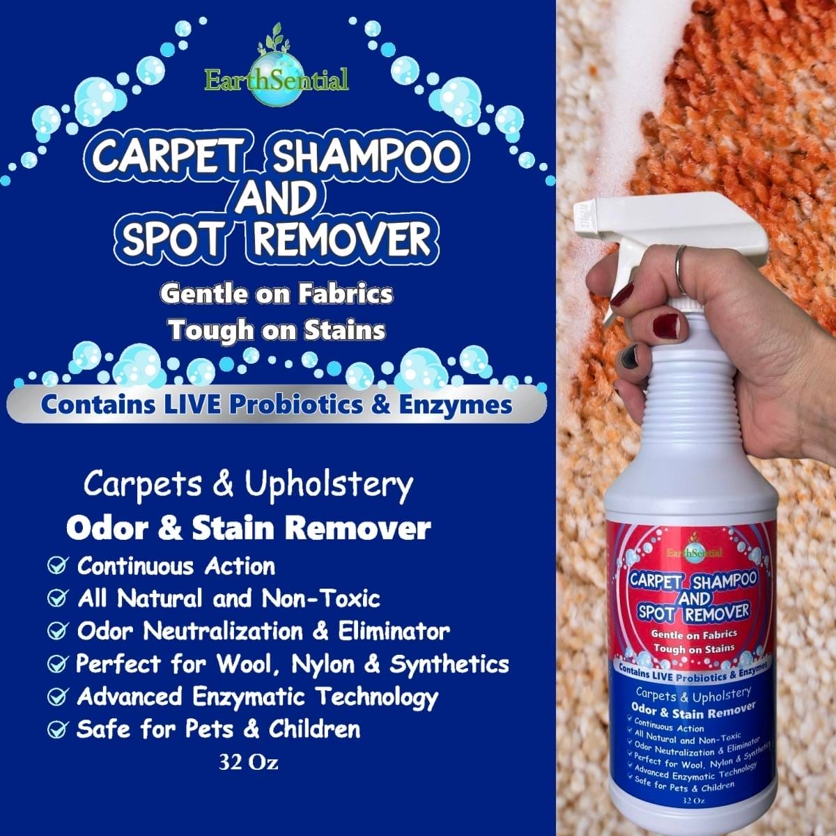 Specially formulated to refresh your carpets while staying gentle on fabrics and safe for family and pets. Powered by enzymes and live probiotics, it keeps cleaning to break down tough stains.